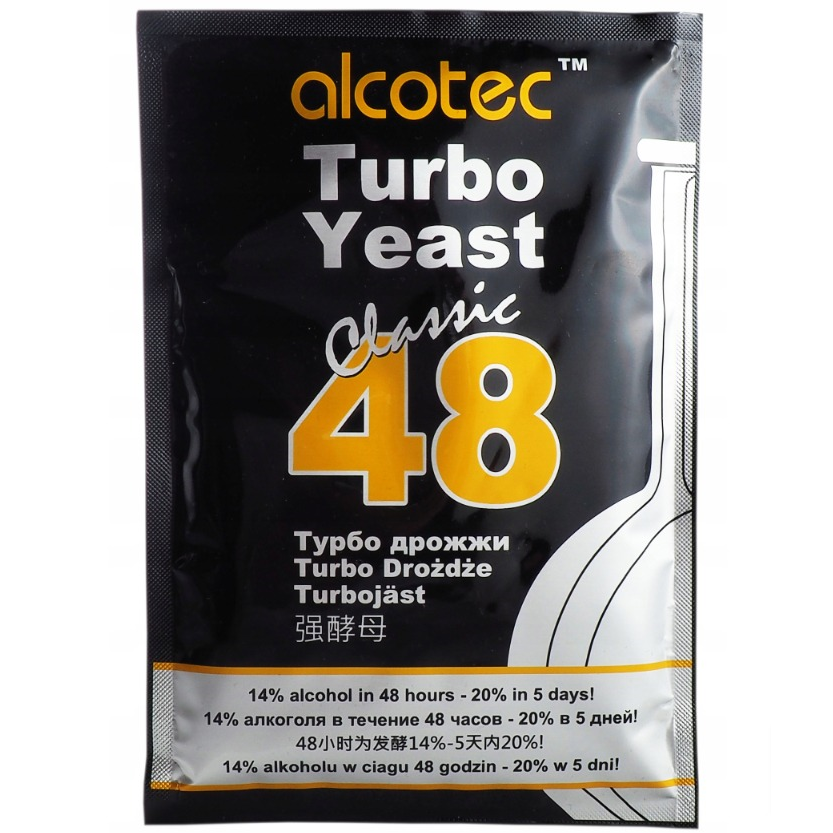 Alcotec Turbo Yeast 48 Classic to specjalnie wyselekcjonowane i wysoko alkoholizujące drożdże przeznaczone do fermentacji nastawów cukrowych. Zestaw zawiera dawkę enzymów ułatwiających fermentację. Opakowanie na 25 litrów nastawu cukrowego. Optymalna temperatura fermentacji zależy od użytej ilości cukru.