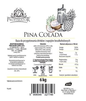 Baza do drinków i bezalkoholowych koktajli Profimator Pinacolada, box 6 kg Jeśli marzysz o tropikalnym smaku w każdym łyku, to ten koncentrat jest właśnie dla Ciebie! Dzięki niemu łatwo przygotujesz klasyczny, orzeźwiający drink, który przeniesie Cię na słoneczną plażę, bez wychodzenia z domu. Doskonały do produkcji domowych koktajli, drinków i innych napojów alkoholowych, a także do…